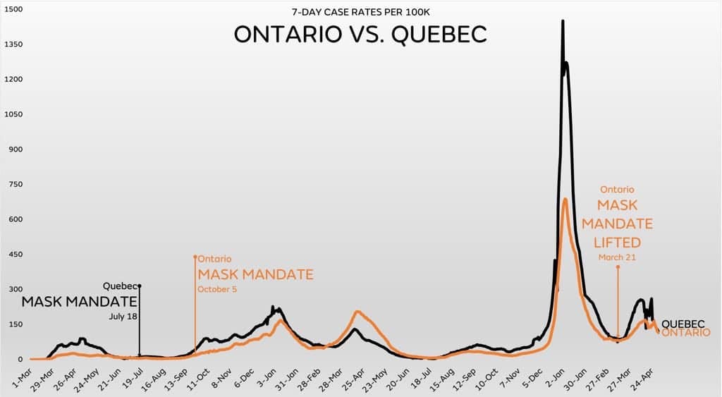 Quebec has an ongoing mask mandate. Conversely, Ontario, a close neighbor, lifted theirs 1.5 months ago. The result, Ontario has had lower case rates than Quebec every day since the termination of their mandate